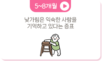 새로운 사람, 새로운 장소에 불안해하는 낮가림을 보이지만, 애착대상인 부모에게 한없는 애정을 표현하여 육아의 보람을 느끼게 하는 시기입니다. 세상을 탐색하느라고 열심히 기어다니고 손에 잡히는 모든 물건은 입으로 가져가는 시기이므로 주의가 필요합니다.
